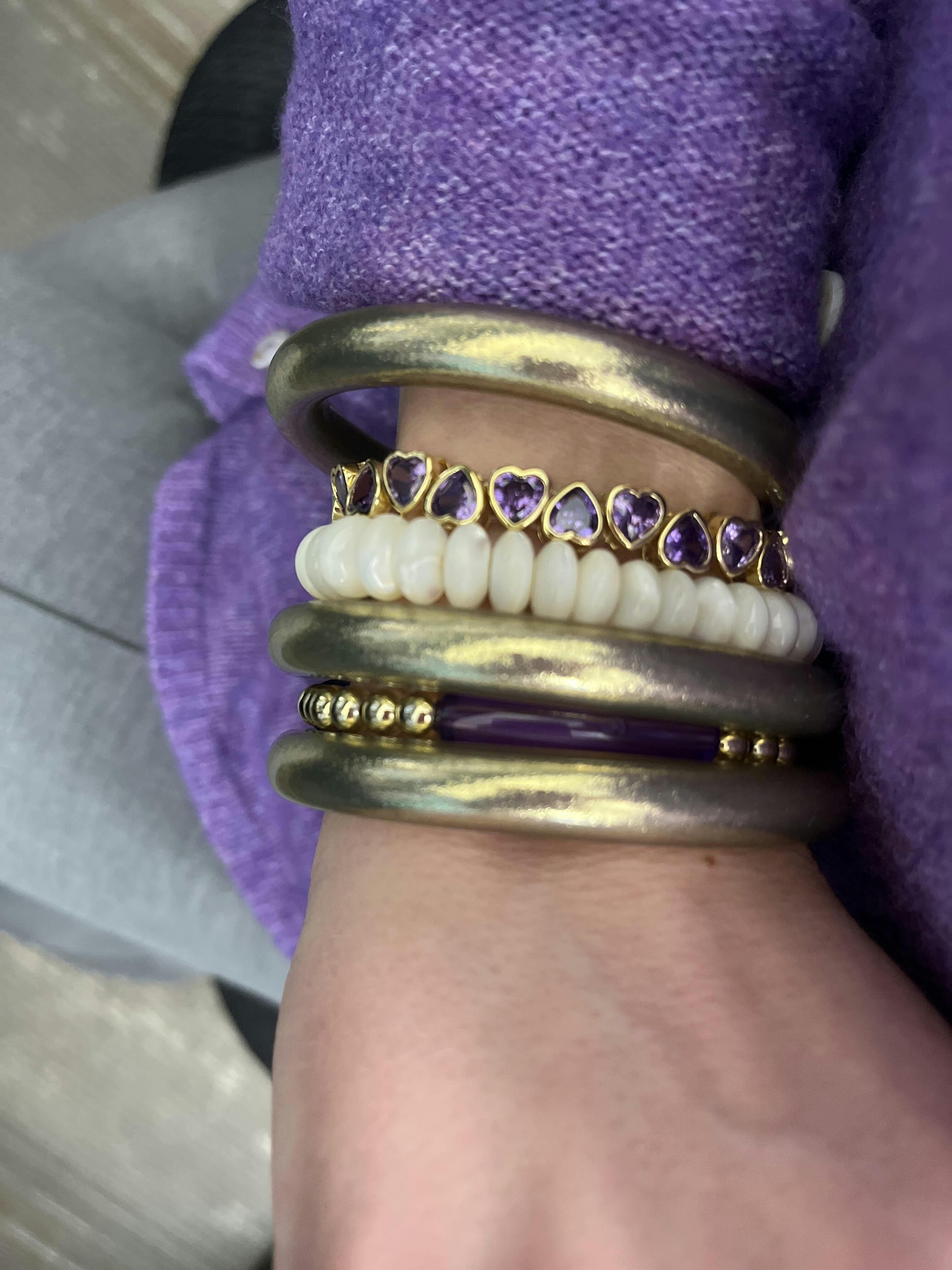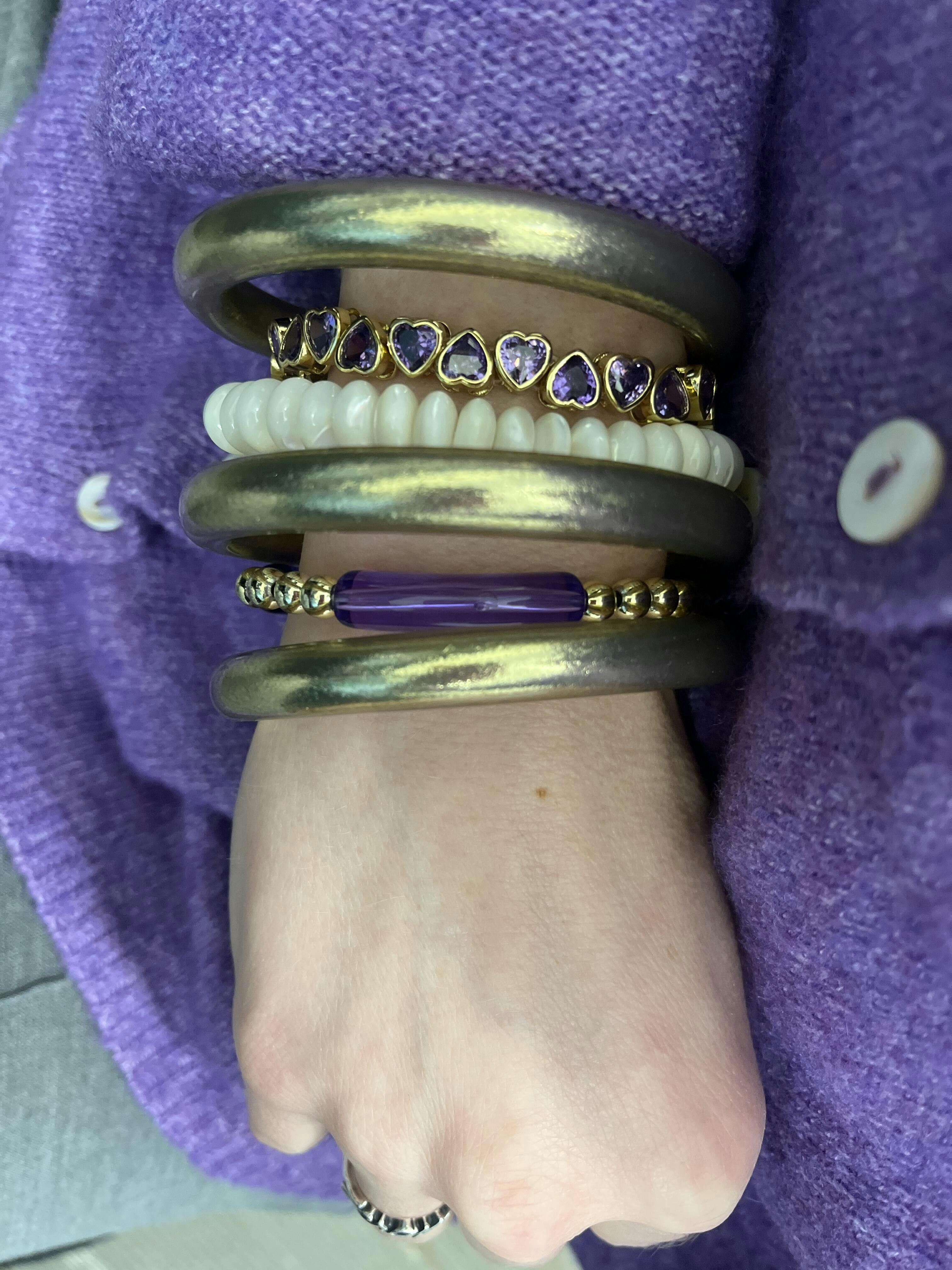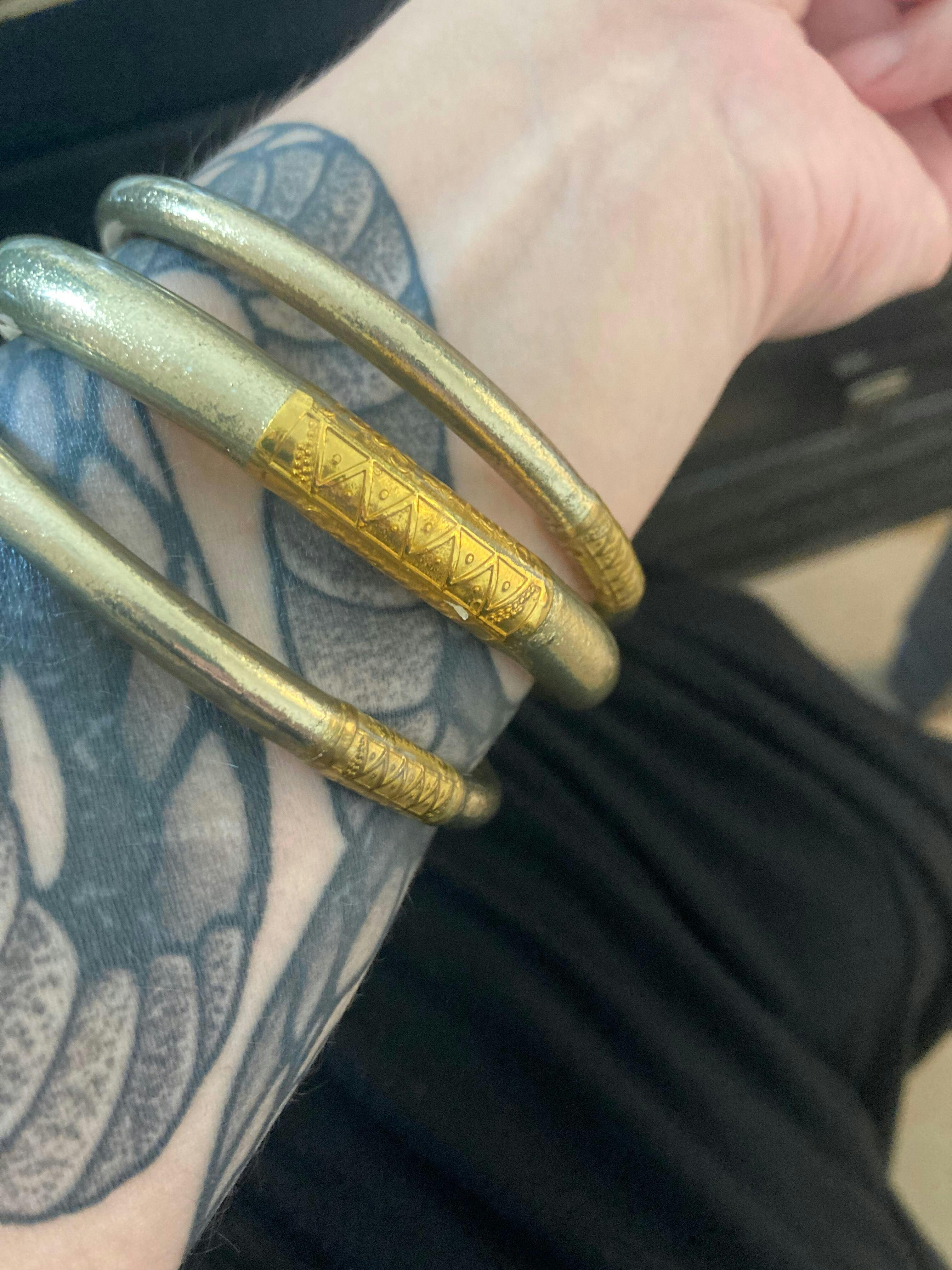 Hecho a mano en Tailandia por artesanos excepcionalmente hábiles, cada Tzubbie Etoile All Weather Bangle es meticulosamente elaborado por un equipo de más de 20 artesanos, haciendo de cada brazalete una labor de amor. Utilizando materiales orgánicos, pueden ocurrir variaciones de color naturales debido a las condiciones de humedad y temperatura. Con el tiempo, el latón sin recubrimiento de nuestra Serenity Prayer Bead puede desarrollar una pátina verdigris, añadiendo a su encanto. La esencia del Tzubbie Etoile All Weather Bangle radica en su capacidad para envejecer con gracia, adquiriendo carácter mientras conserva su belleza inherente, al igual que las mujeres notables que los usan.