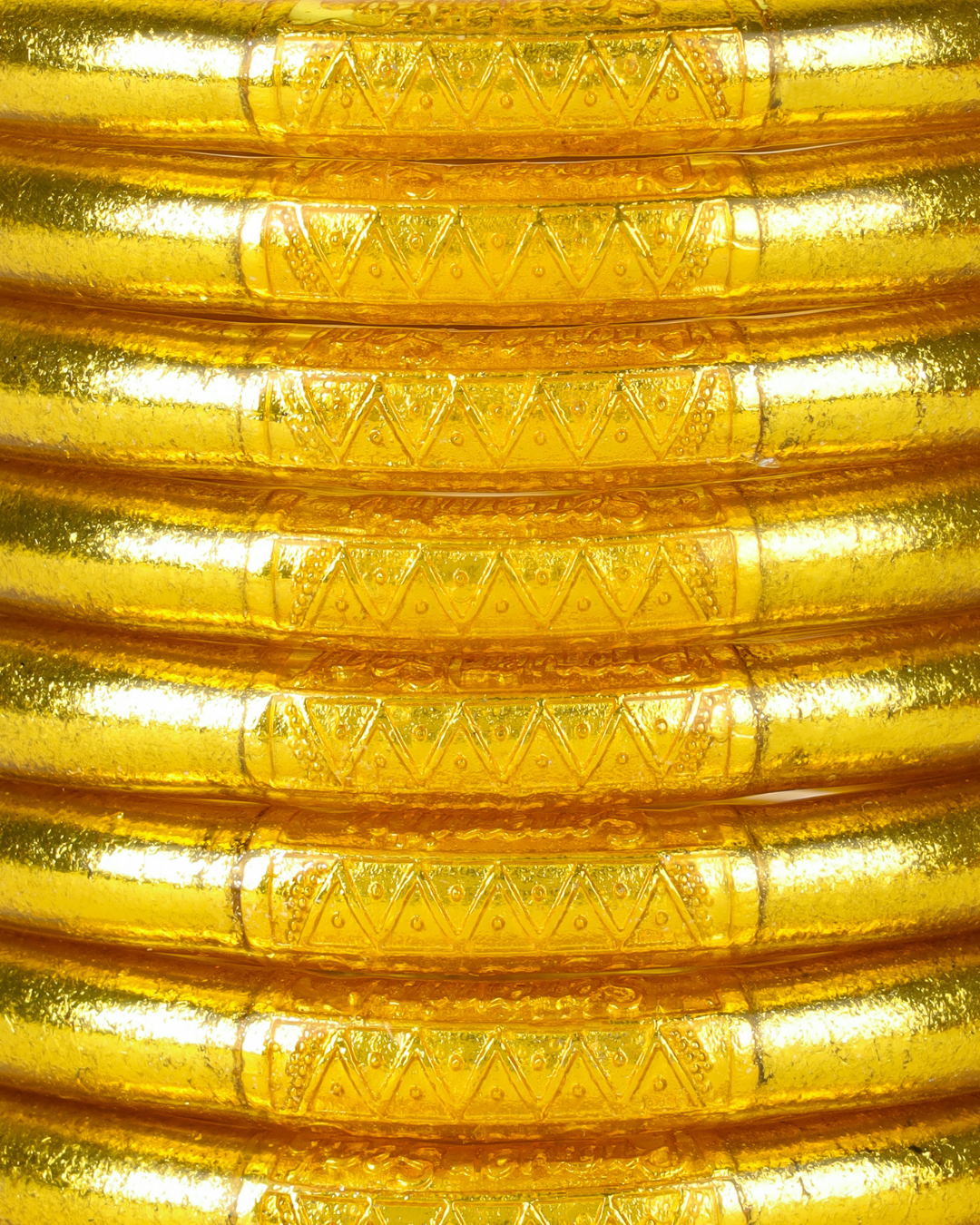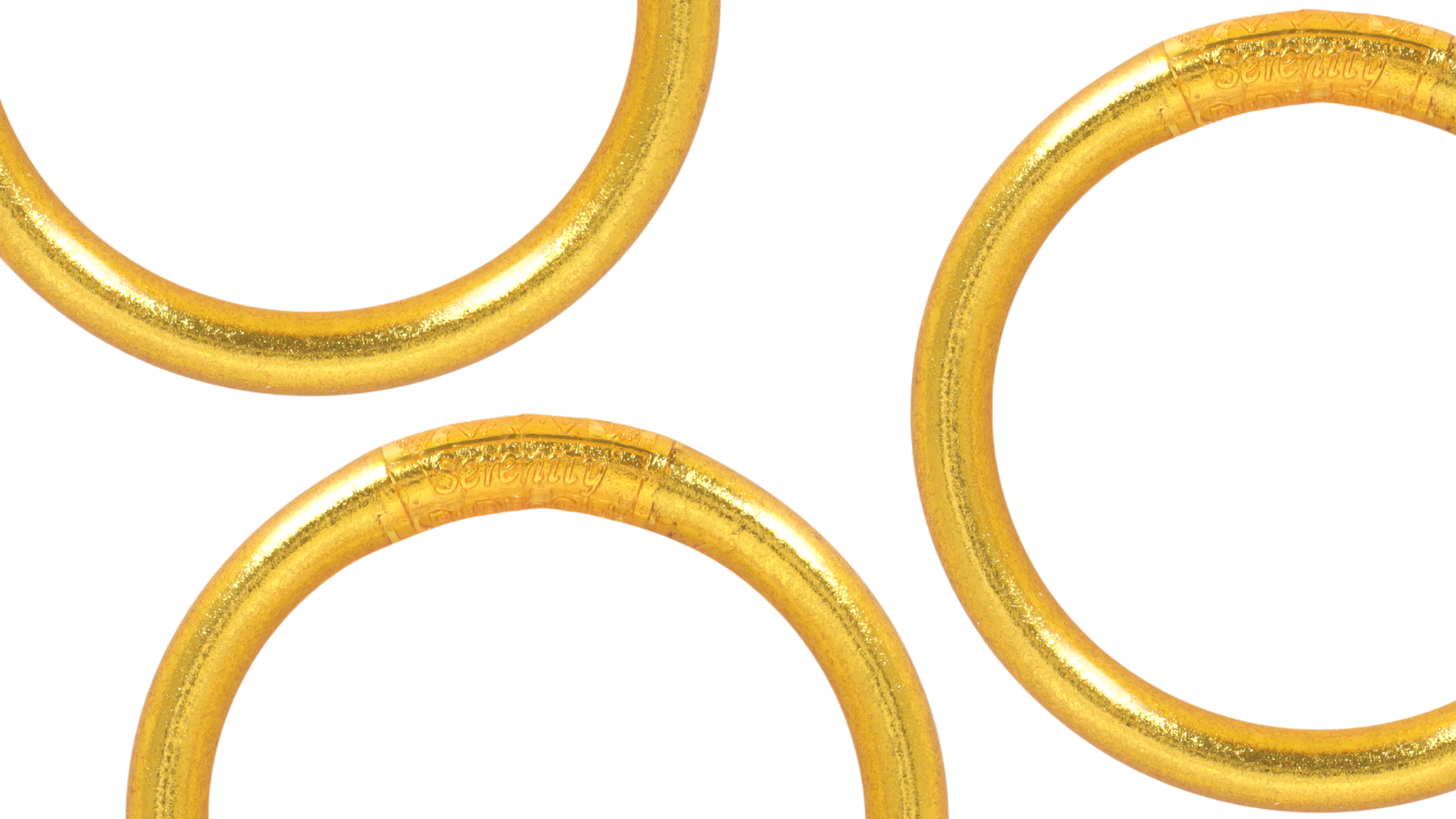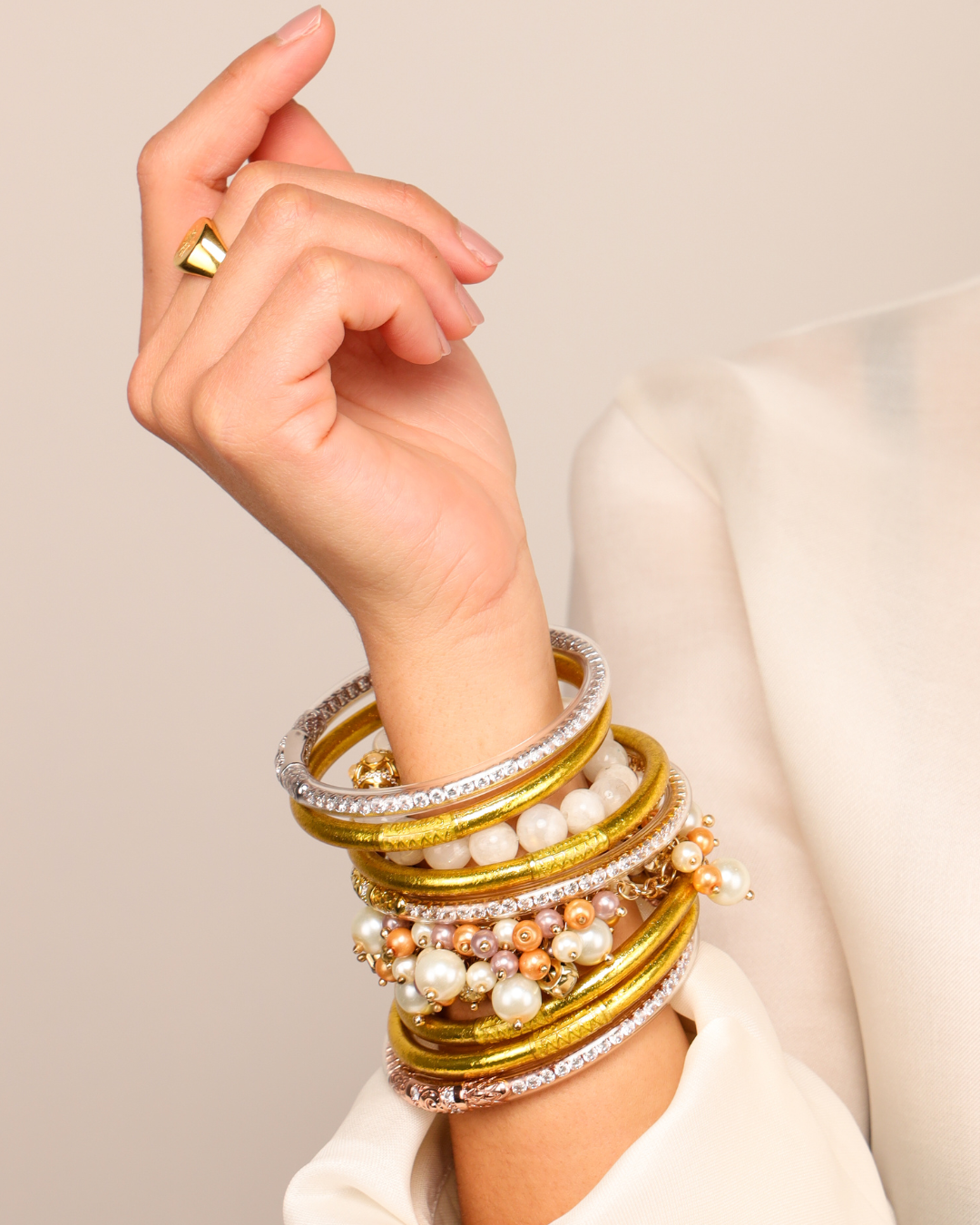Construidos con anillos flexibles de policarbonato de vinilo infundidos con delicadas hojas de oro, y luego sellados con la cuenta de la Oración de la Serenidad de BuDhaGirl, nuestros Gold All Weather Bangles® encarnan la versatilidad. Desde la piscina hasta la sala de juntas y el aeropuerto, estos brazaletes se mantienen en su lugar, permitiéndote navegar cualquier terreno sin necesidad de quitártelos. Guardados en una funda de seda personalizada de BuDhaGirl All Weather Bangles, cada brazalete es un testimonio de la meticulosa artesanía de los artesanos (más de 20 artesanos trabajan en cada brazalete) en Tailandia.