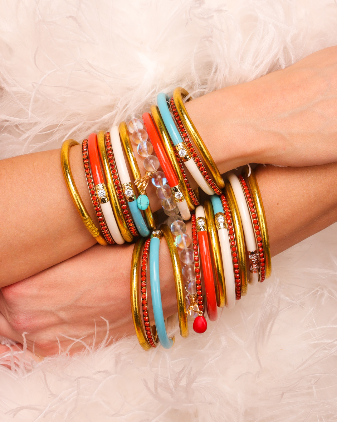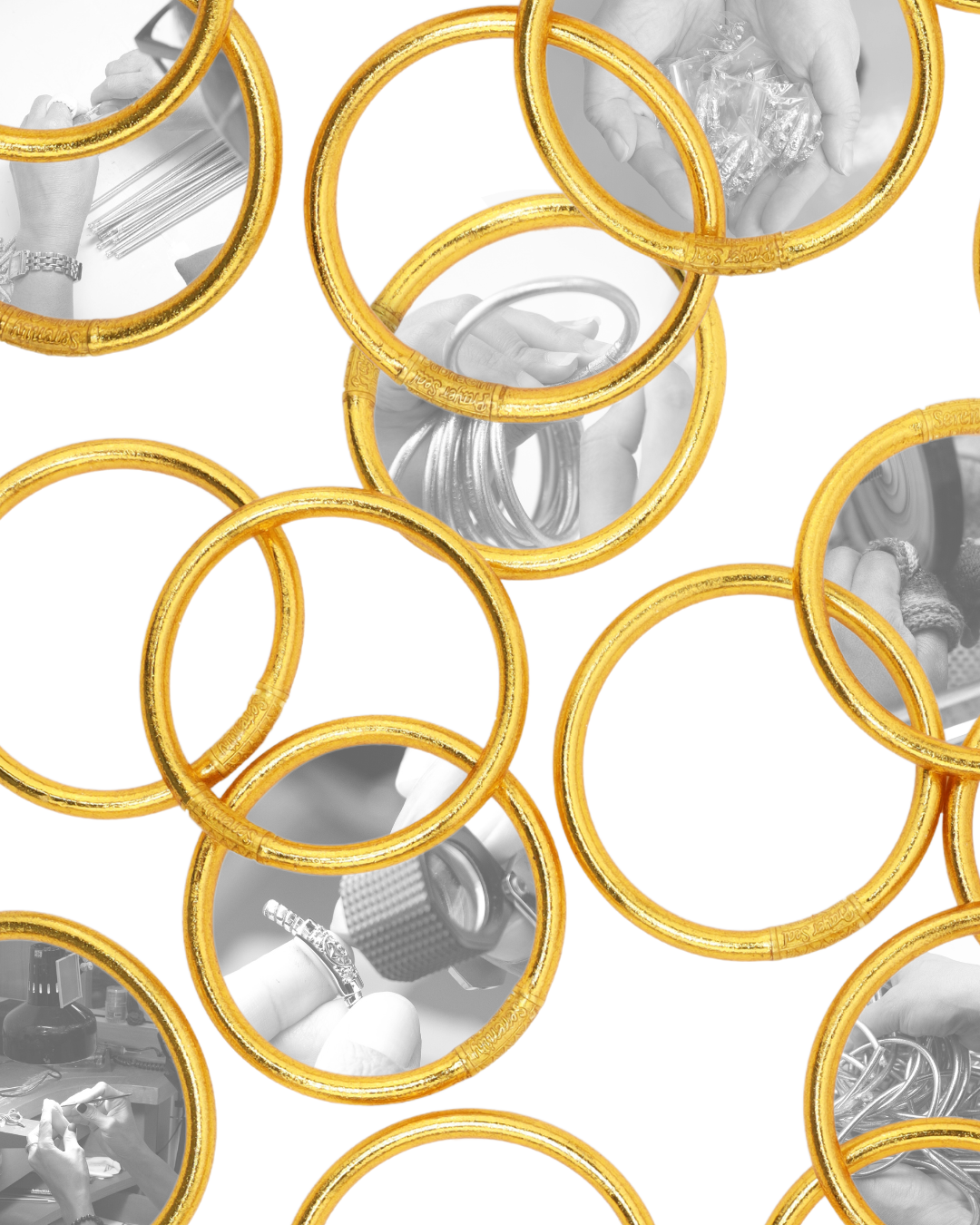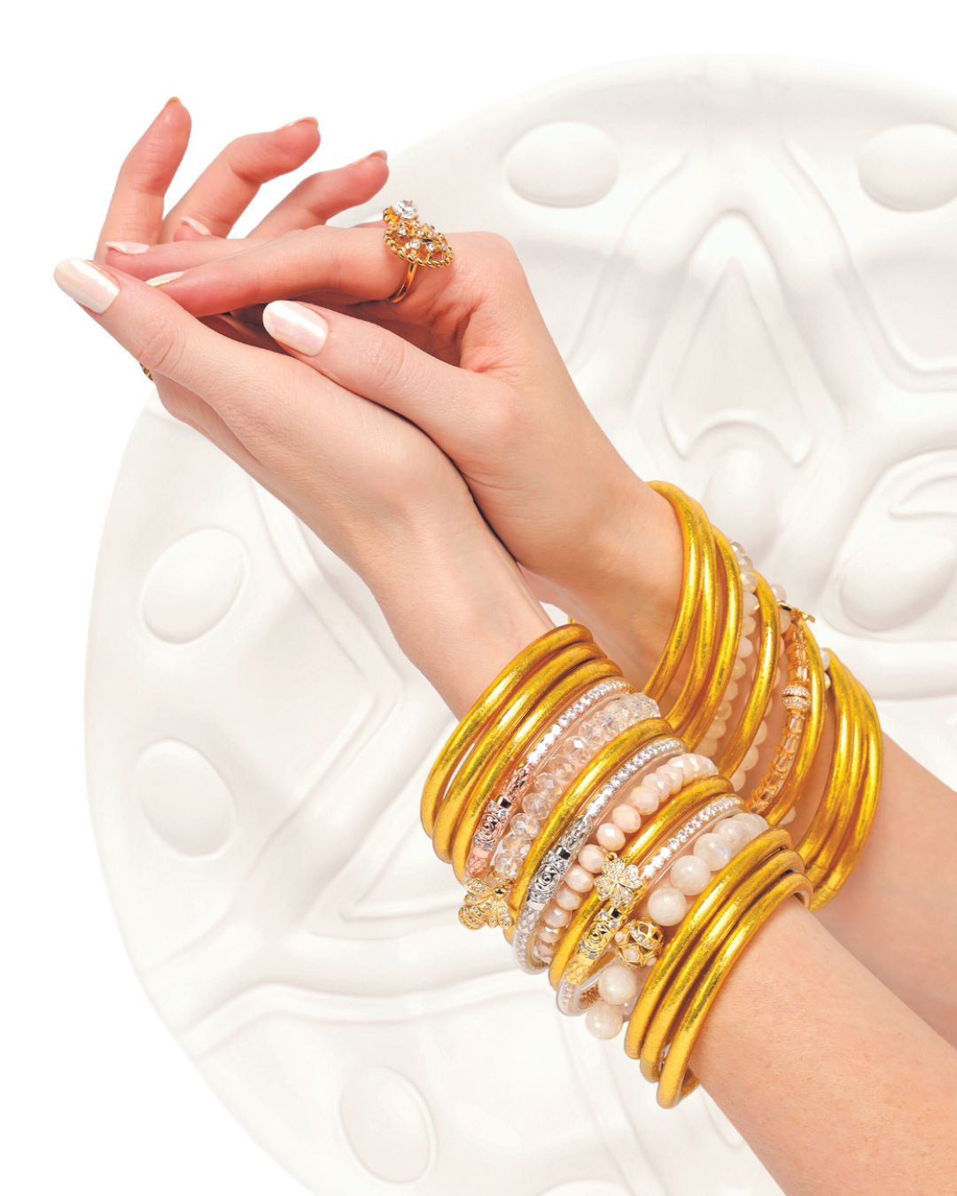 Construidos con anillos flexibles de policarbonato de vinilo infundidos con delicadas hojas de oro, y luego sellados con la cuenta de la Oración de la Serenidad de BuDhaGirl, nuestros Gold All Weather Bangles® encarnan la versatilidad. Desde la piscina hasta la sala de juntas y el aeropuerto, estos brazaletes se mantienen en su lugar, permitiéndote navegar cualquier terreno sin necesidad de quitártelos. Guardados en una funda de seda personalizada de BuDhaGirl All Weather Bangles, cada brazalete es un testimonio de la meticulosa artesanía de los artesanos (más de 20 artesanos trabajan en cada brazalete) en Tailandia.