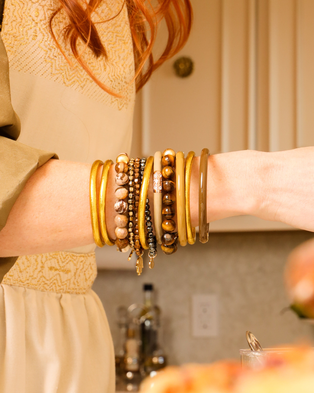 Mindful Glamour Ritual: Pause...Slide your All Weather Gold Bangles on one by one. Focus on being present, and in the Now. Each intention you make will be with you throughout the day...Go, Be it.