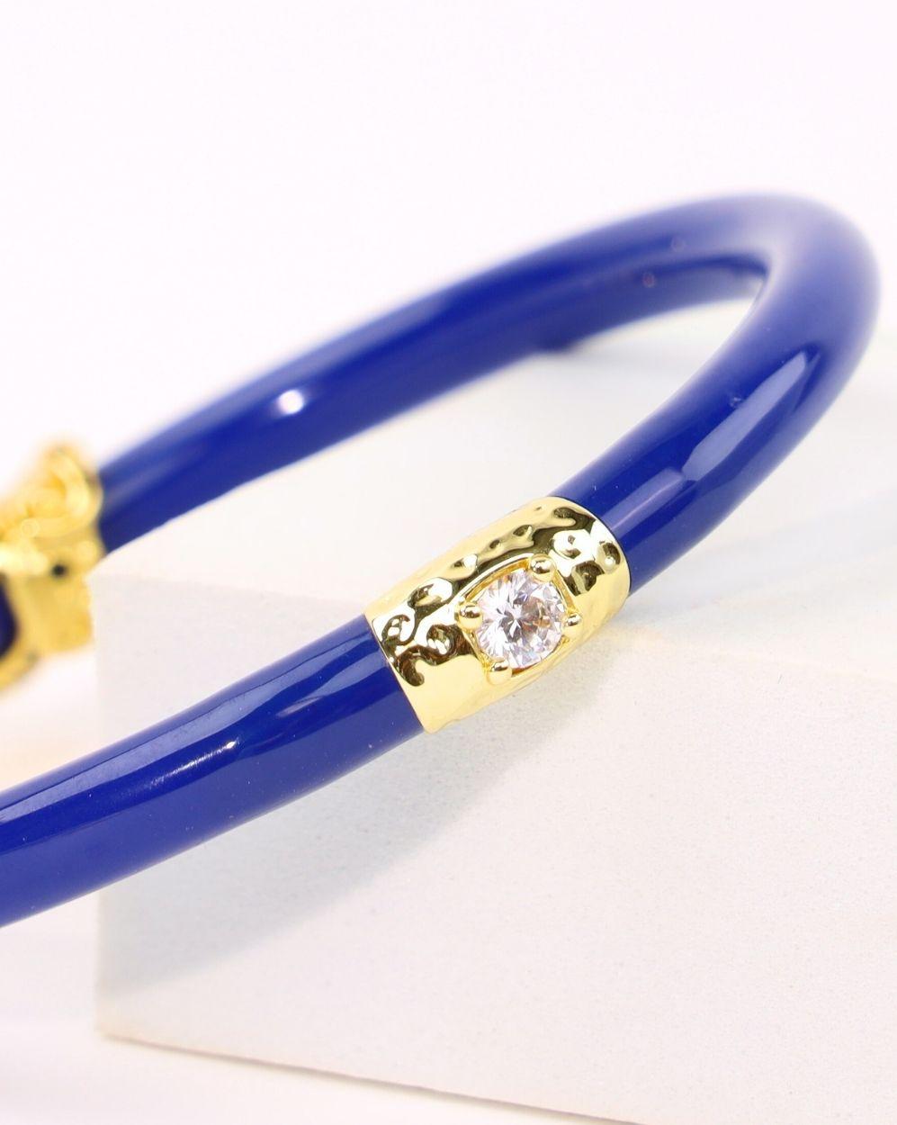 A graceful octopus, sculpted from gold-plated brass, shimmers with clear crystals and deep lapis-blue enamel, radiating a sense of fluid elegance and quiet strength. This captivating creation is finished with our signature tubing, making it a mesmerizing essential for any jewelry collection.