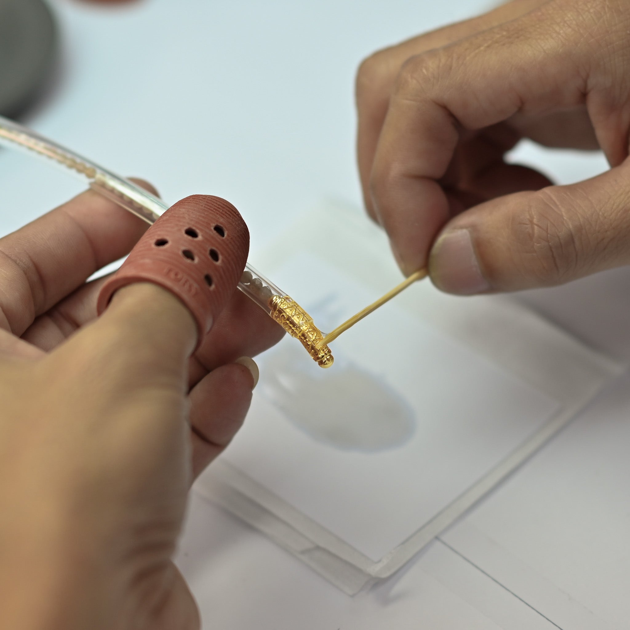 Der nächste Schritt ist der empfindlichste—das Anbringen der Ruheperle—und wird vollständig von Hand ausgeführt. Mit einem speziellen Klebstoff und ruhiger Hand befestigt der Kunsthandwerker die Perle sorgfältig, mit Bedacht und Ehrfurcht an dem golddurchwirkten Röhrchen. Dieser stille Moment der Vereinigung bringt alle Elemente zusammen: thailändische Handwerkskunst, feinen Schmuck und rituelles Design. Hier trifft Form auf Bedeutung, und Ihr All Weather Bangle® wird vollständig—bereit, Ihre Absichten in die Welt zu tragen.