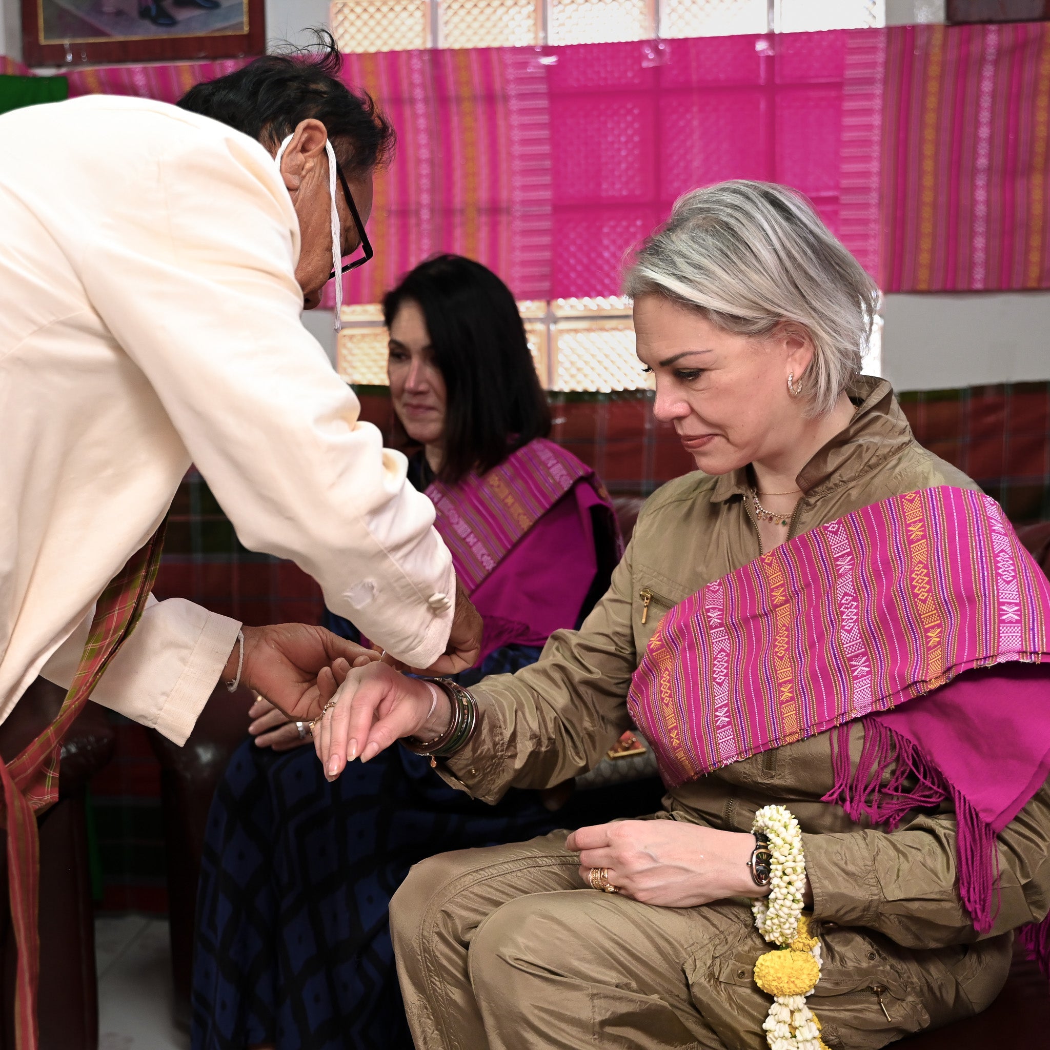 In einem Moment, der zugleich persönlich und tiefgründig ist, bindet der Dorfälteste die heilige Sai-Sin-Schnur um Jessicas Jesse Handgelenk – eine Geste des Schutzes, der Einigkeit und des herzlichen Segens. Für Jessica ist dies mehr als eine Zeremonie. Es ist eine tiefe Anerkennung der Kunsthandwerker, Familien und Bräuche, die jedem BuDhaGirl-Armband Leben einhauchen.