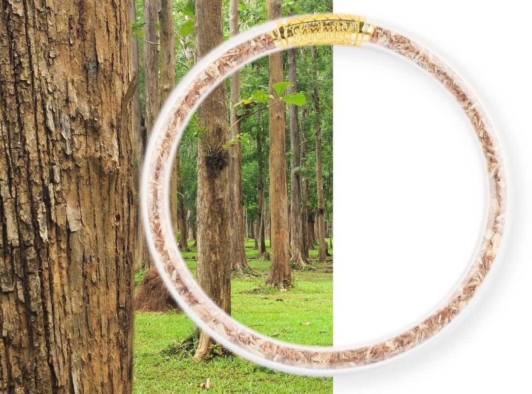 Inspired by reclaimed teak wood from Thailand, this bangle not only symbolically celebrates the natural beauty of the Thai forests but also embodies the principles of renewal and resourcefulness. Add this to your wristscape as a symbol of harmony between humanity and nature, reminding you to tread lightly on our planet and cherish its precious resources for generations to come.