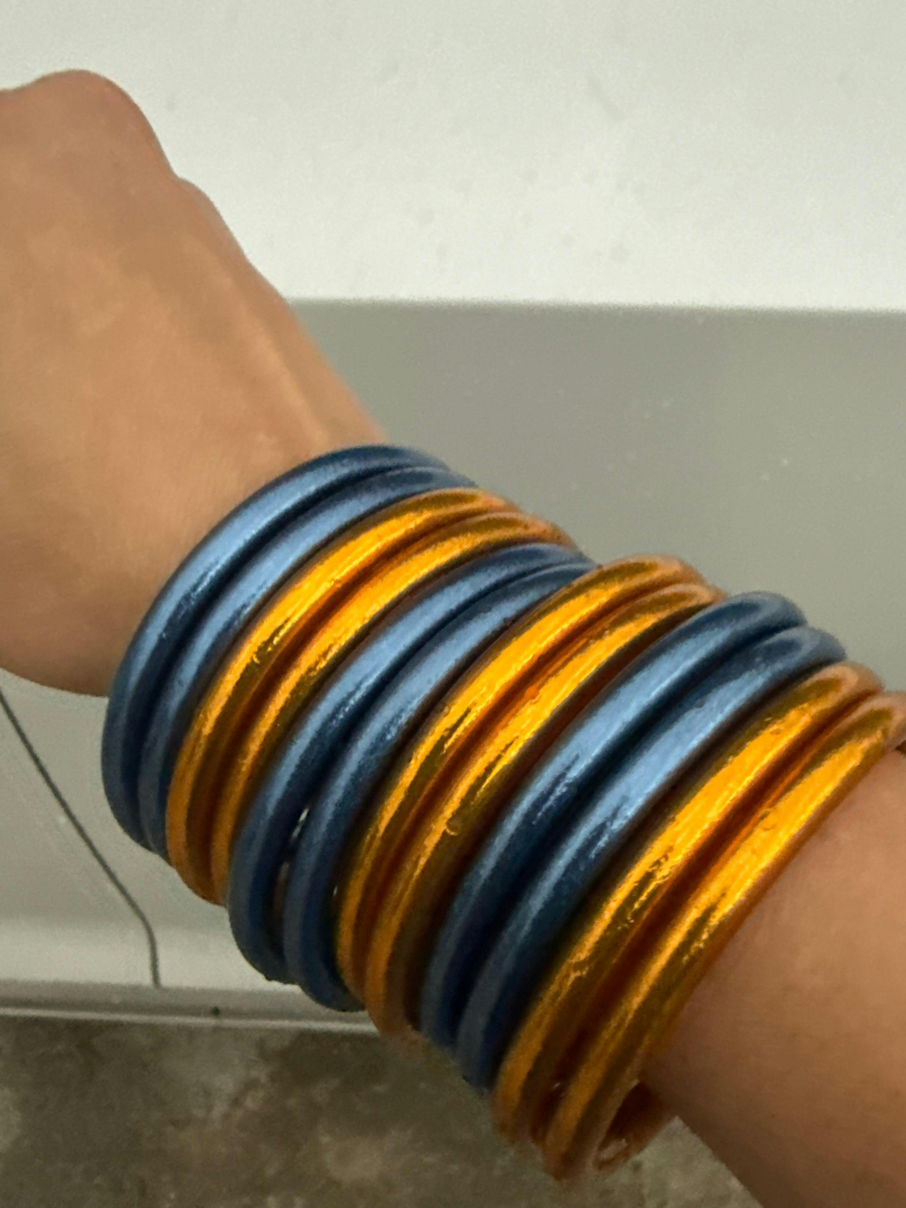 BuDhaGirl Marine All Weather Bangles® (AWB®) sind der Inbegriff von Luxus in BuDhaGirls beeindruckender Lifestyle-Kollektion und fangen die Geheimnisse der tiefsten Blautöne des Ozeans ein. Unsere bemerkenswerten Armreifen definieren Eleganz neu mit ihrem gewichtslosen, geräuschlosen, wasserdichten und TSA-sicheren Design. Perfekt gefertigt, besteht jedes Set aus sechs Armreifen, die Absichten für den Tag symbolisieren. Tragen Sie sie überall, da ihre geräuschlose und wasserdichte Beschaffenheit eine nahtlose Integration in jede Umgebung gewährleistet.